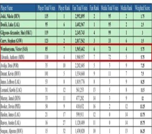 根據(jù)NBA規(guī)則,當(dāng)兩人最終排名系數(shù)一樣時(shí),以球迷投票為準(zhǔn),因此文班亞馬得以力壓愛德華茲首發(fā)入選全明星。