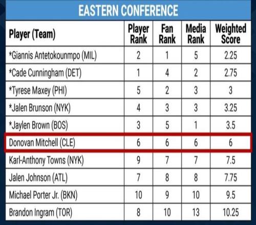 先說東部,首發(fā)五人不管是球員投票、球迷投票還是媒體投票都在前五,因此排在第六的米切爾最終排名系數(shù)與前五人其實(shí)有不小差距,即便三項(xiàng)投票之一能往上提升一點(diǎn),米切爾大概率也無(wú)法擠掉布朗或者布倫森。