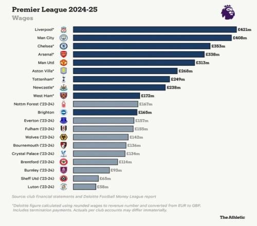 The Athletic:曼聯(lián)24/25賽季的工資支出排名英超第5